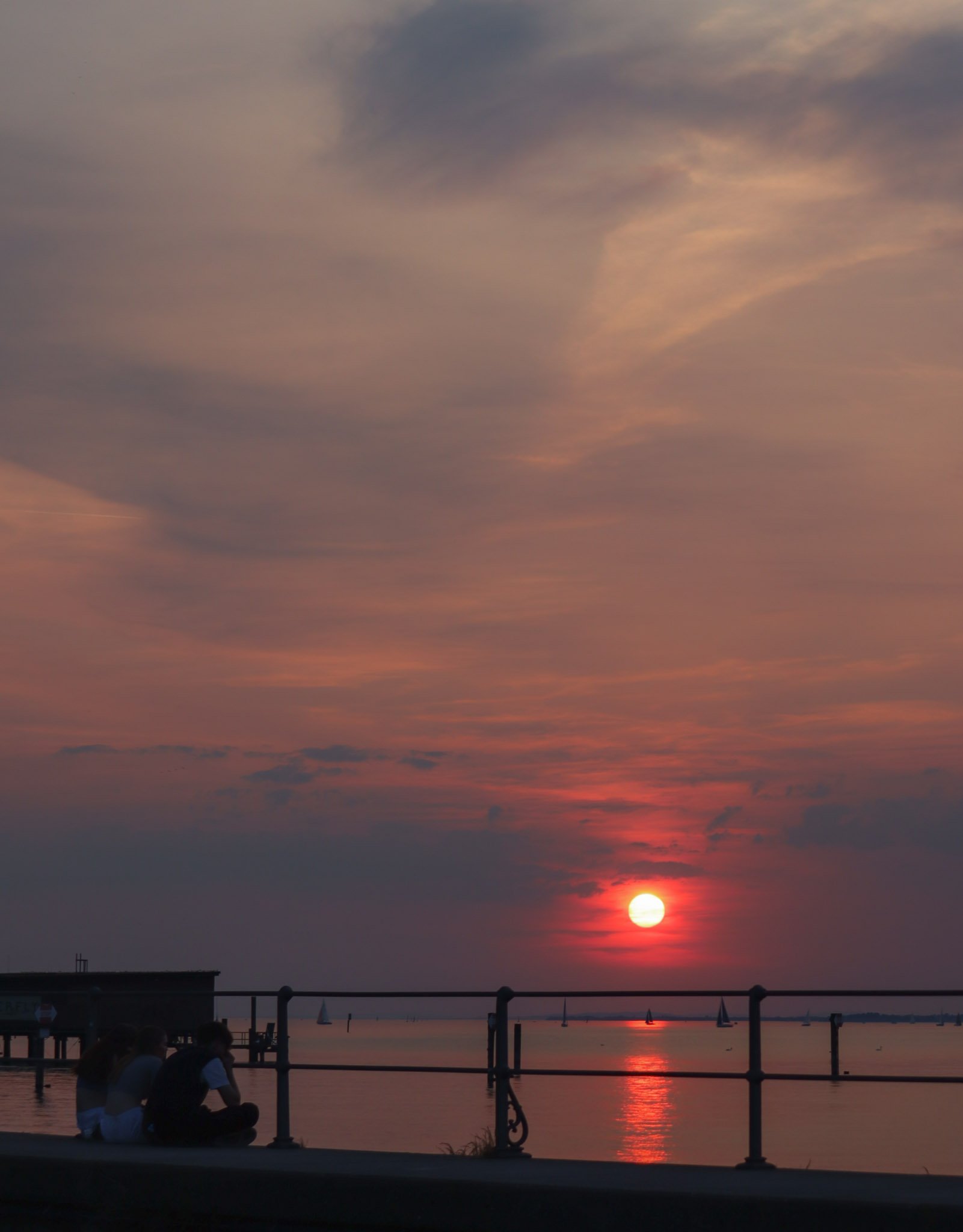 Teenagers enjoying an extremely orange sunset over Lake Constance