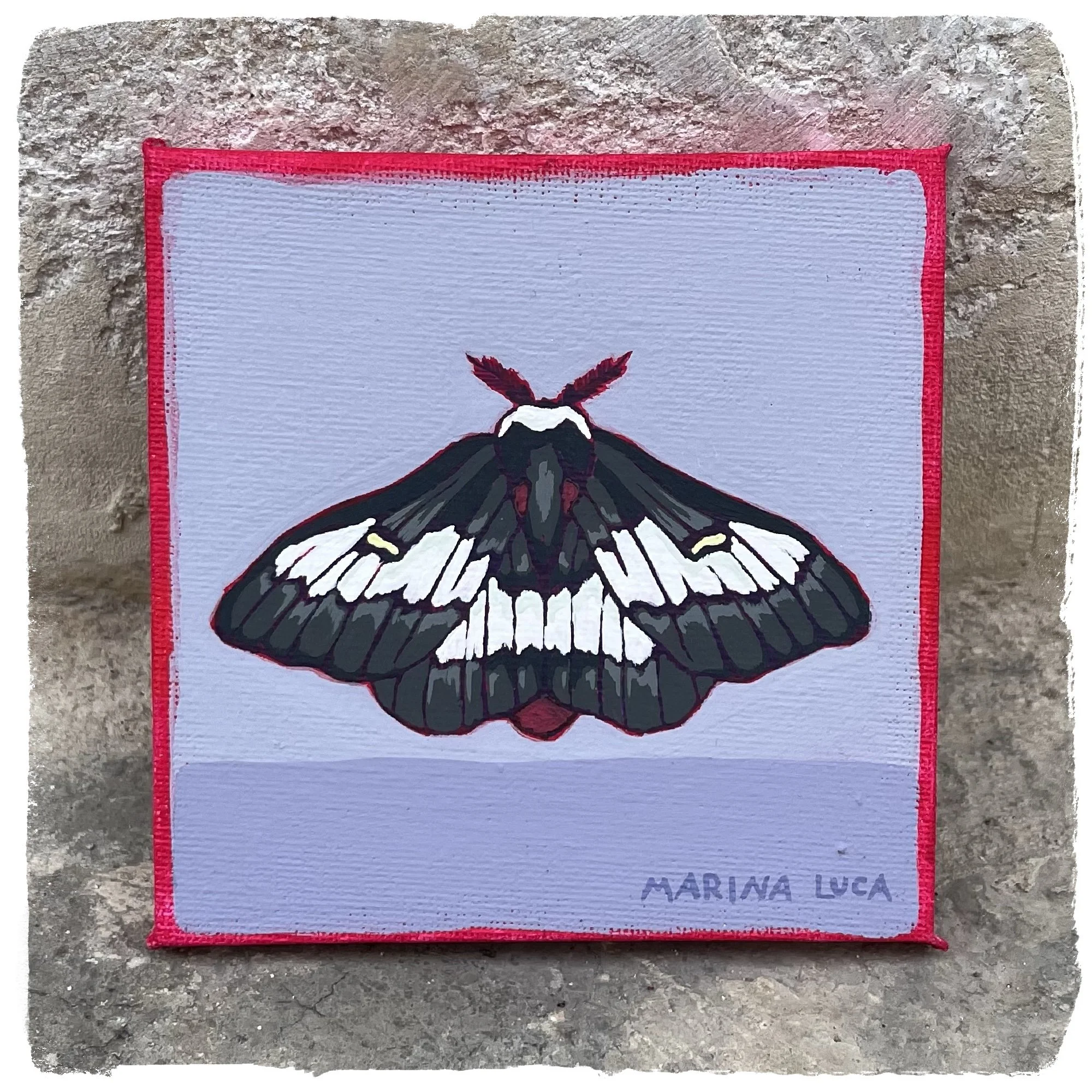 A Nevada Buck moth, 9/12 of 'a dozen moths' series. Painted using acrylics and lime wash.