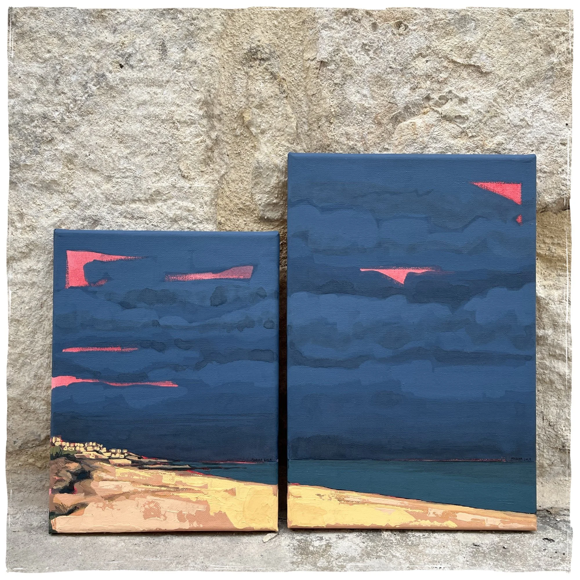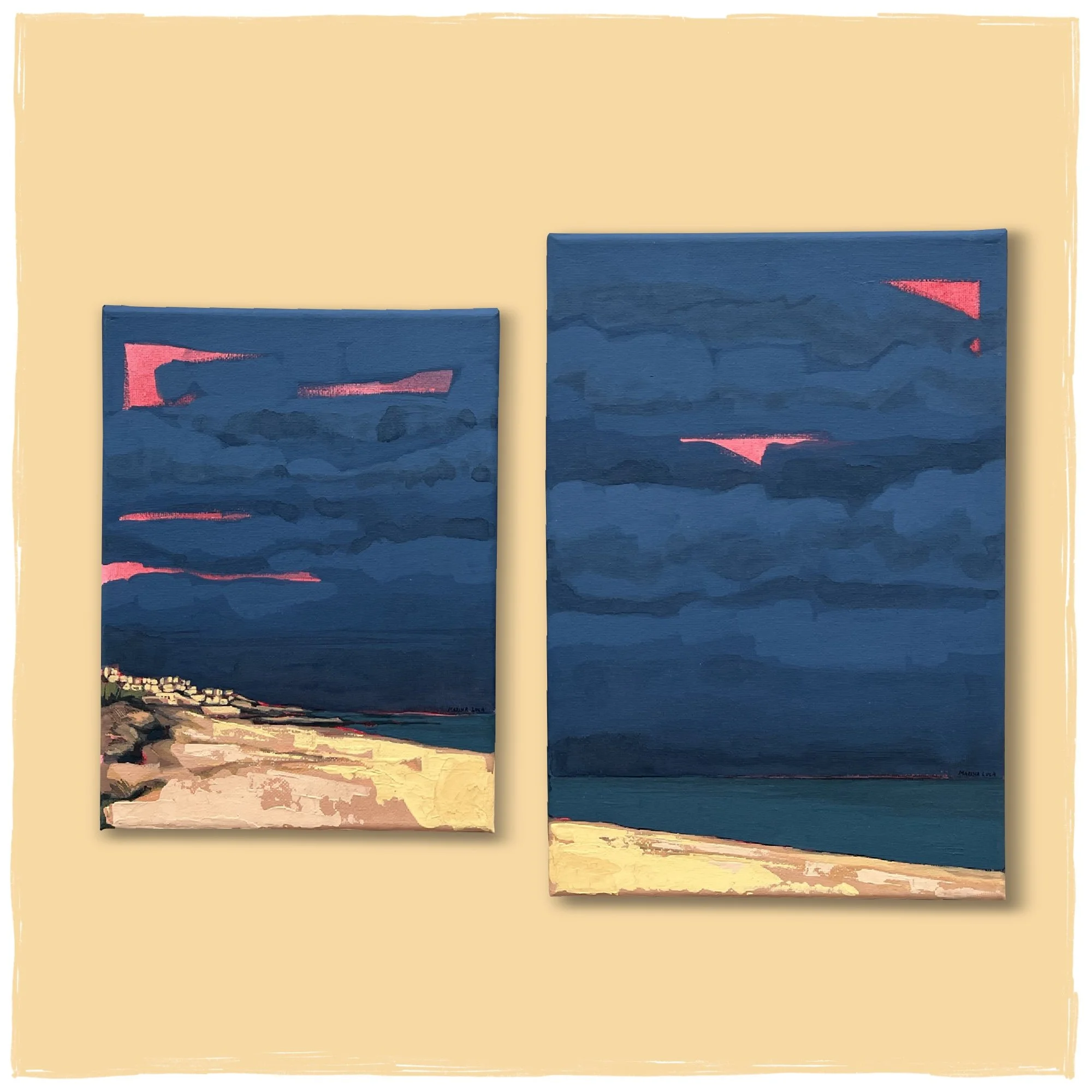 A meaningful contrast created by the golden hour at Bruca Beach (Scicli, Italy) against a dark, stormy sky. Painted using acrylics and lime wash.